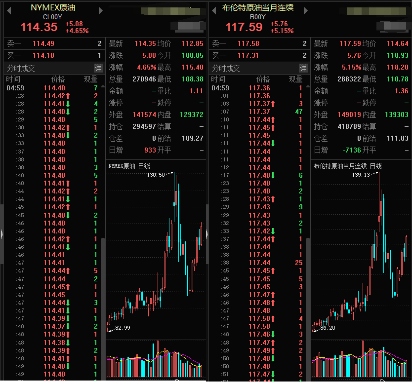 受俄乌谈判消息影响,金融市场高通胀担忧重燃。原油、天然气等商品价格再度走高。欧洲天然气盘中涨幅一度达到34%左右,国际油价大幅上涨。截至今日凌晨收盘,国际原油期货结算价涨约5%,WTI 5月原油期货结算价涨幅4.78%,报114.93美元/桶。布伦特5月原油期货结算价涨幅5.30%,报121.60美元/桶。